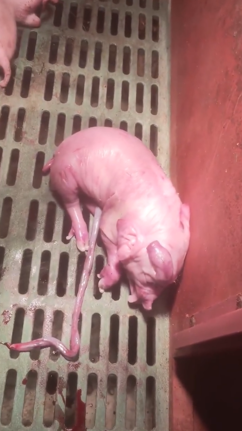 Until the last piglet was born on the gray plastic floor.