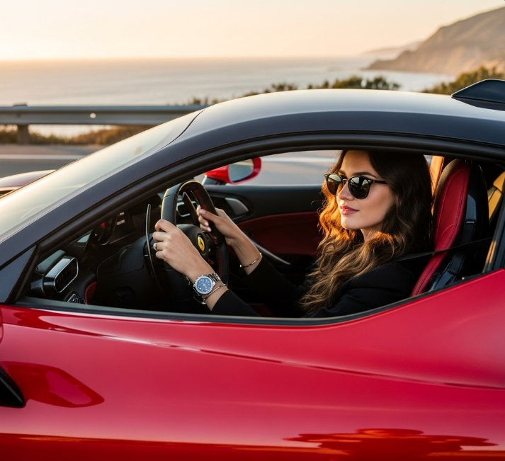Leaving all boundaries behind, let’s admire the portrait of modern success: A proud, confident young woman behind the wheel of a vibrant red Ferrari, gliding under the sunset along the coast. The perfect combination of captivating beauty, commanding presence, and a multi-million dollar speed machine creates an irresistible allure.