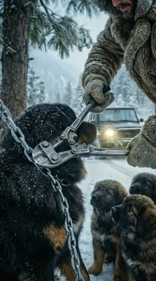 The man knelt on the cold snow, approaching the mother dog. Using all his strength, the muscles in his arms tensing beneath his thick coat, he clamped the pliers tightly onto the cursed chain.