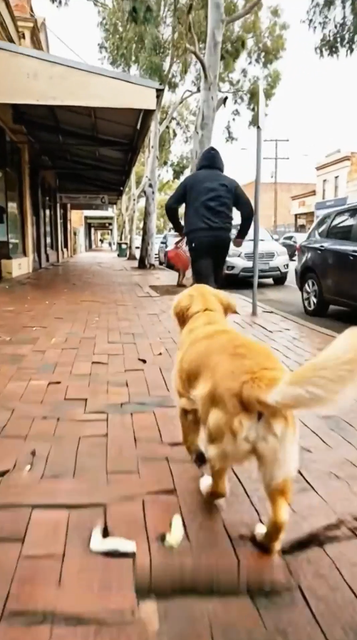 But the thief didn’t realize he was being pursued by a four-legged “agent.” The Golden Retriever, instead of finishing its food, dashed off like an arrow. It barked loudly and followed the thief through the streets until he ran past the table of the grumpy man from earlier. The dog executed a remarkably clever ambush, causing the thief to stumble and drop the bag right where it was placed.